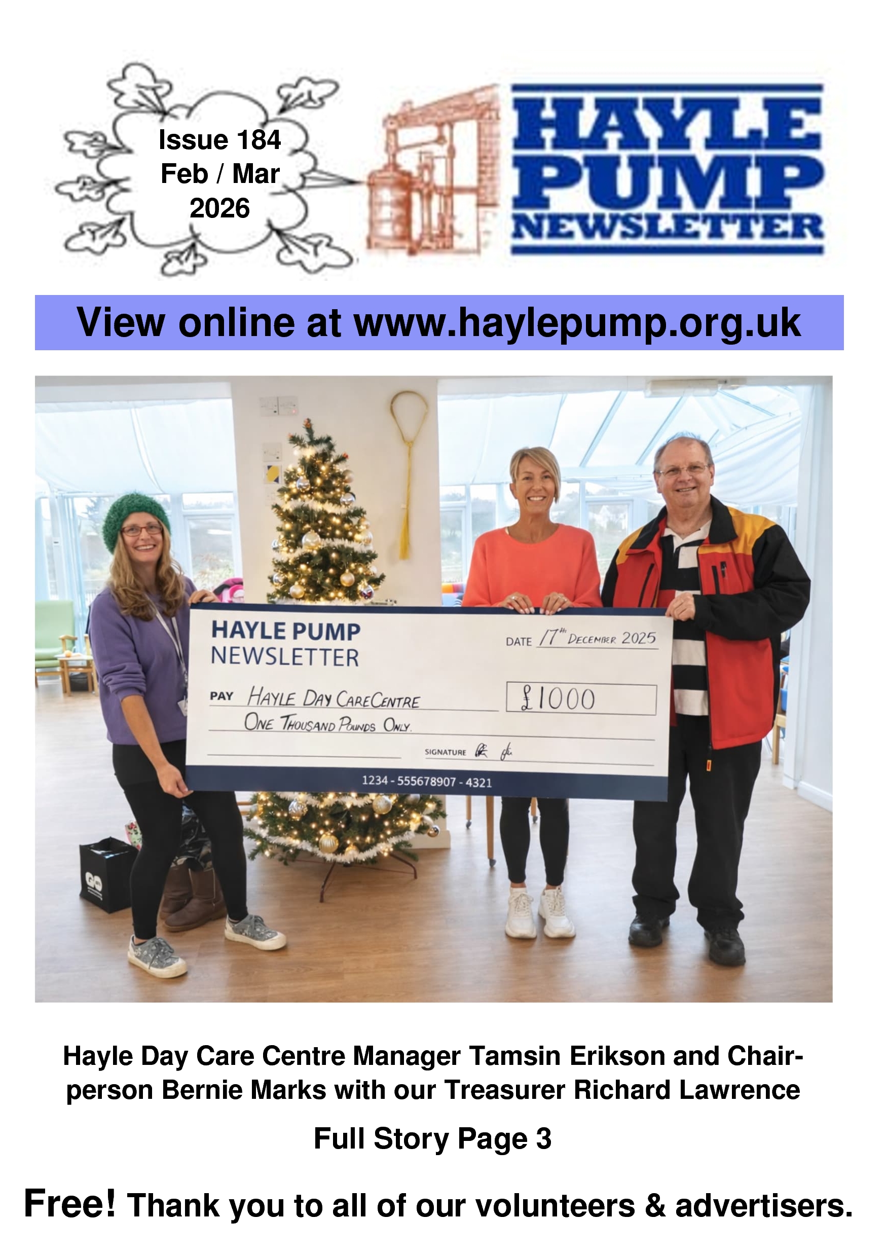 The Hayle Pump newsletter is a bi-monthly 40-page newsletter with 2,500 copies distributed to various locations within the TR27 postcode in Cornwall.